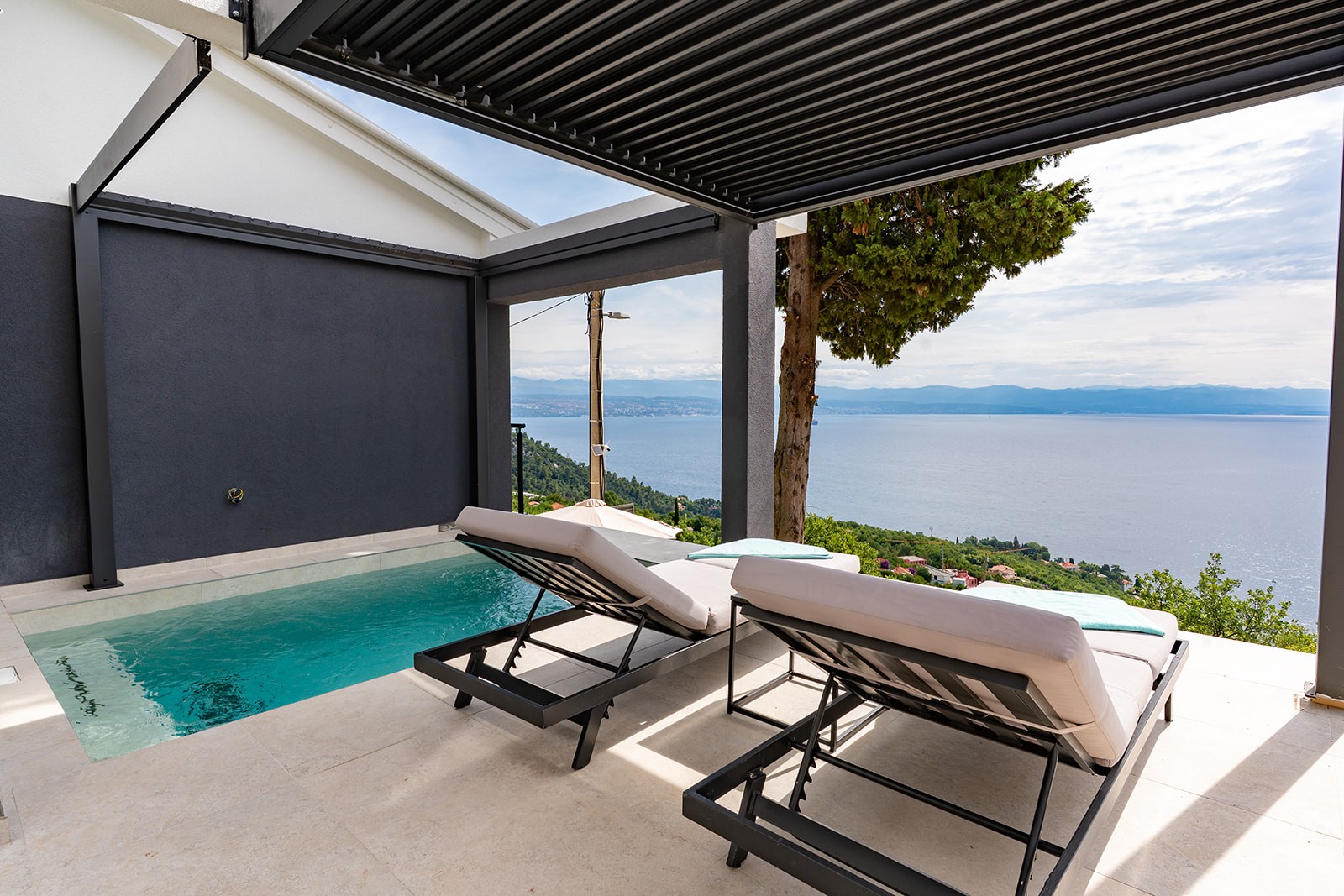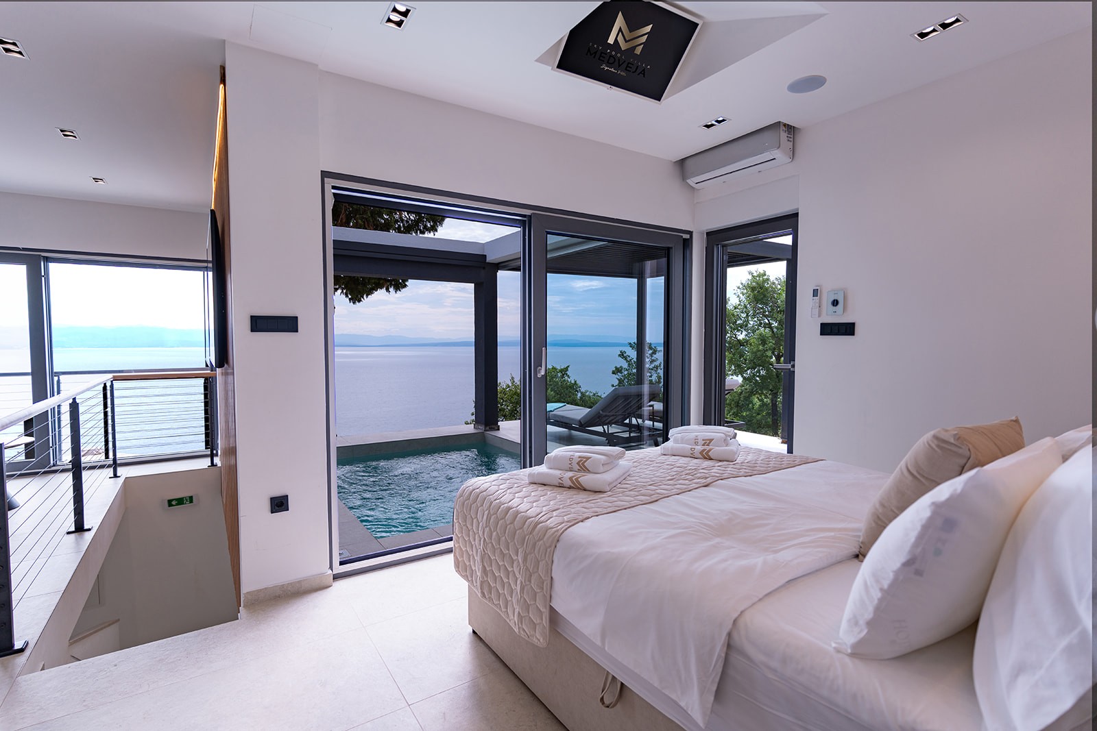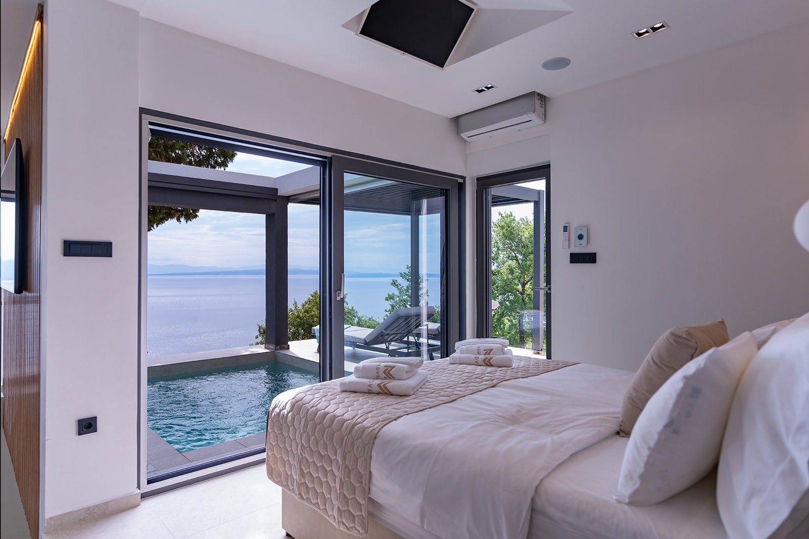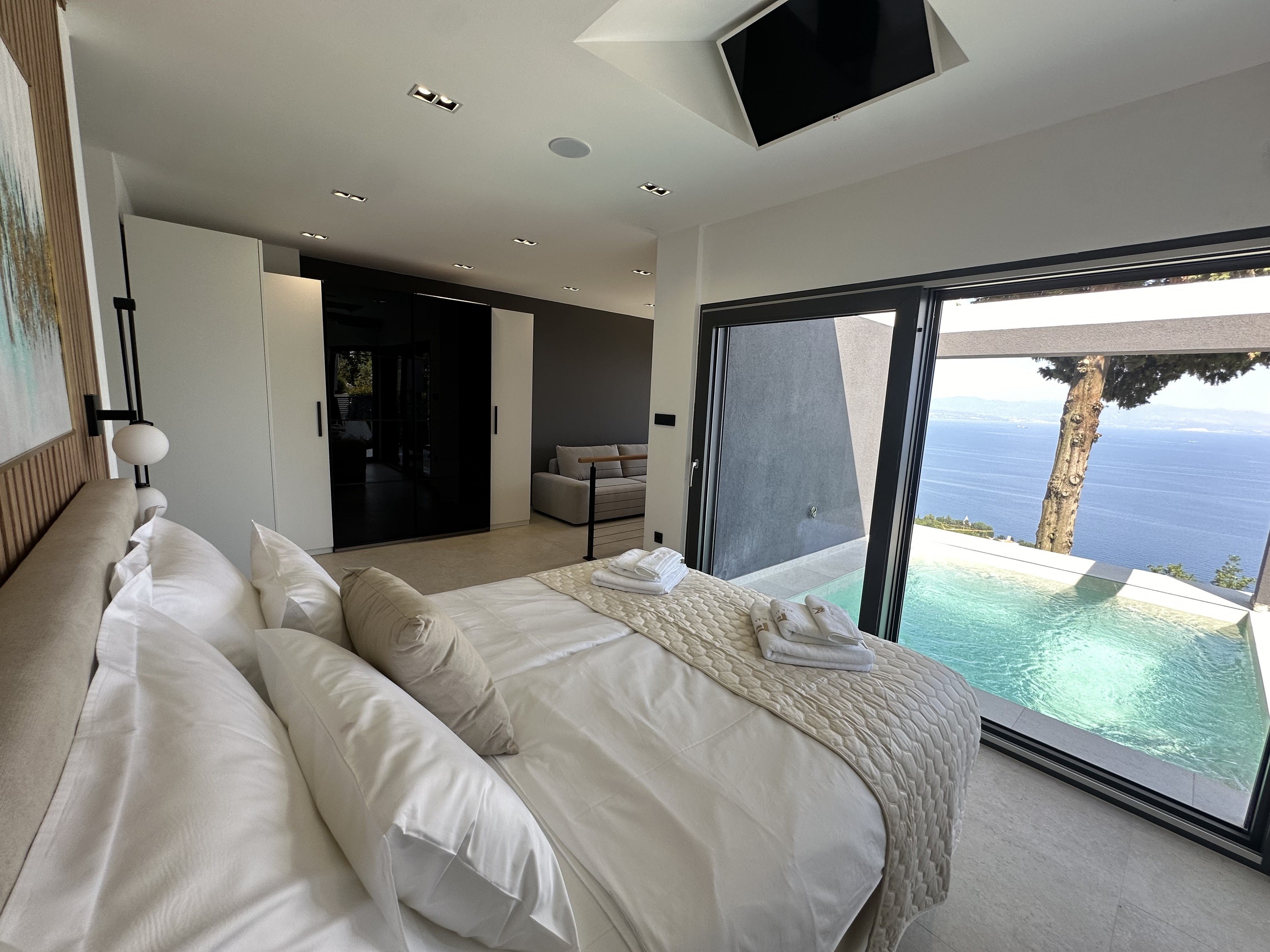 This luxurious villa has a spacious bedroom with an ensuite bathroom, perfect for couples. The bedroom opens directly to a private infinity pool with stunning sea views, offering a peaceful and beautiful setting for your romantic getaway. Thi villa also includes a wellness room with a rejuvenating sauna and freestanding batthub, and a fully equipped kitchen for preparing gourmet meals. Step outside to the outdoor spaces where you’ll find a BBQ for outdoor dining and a manicured garden to enjoy the Mediterranean sunshine. Whether you’re soaking in the pool, indulging in the sauna, or admiring the panoramic sea views from the bedroom, the One Bedroom Sky Pool Villa in Medveja offers a luxurious and unforgettable escape on the Croatian coast.