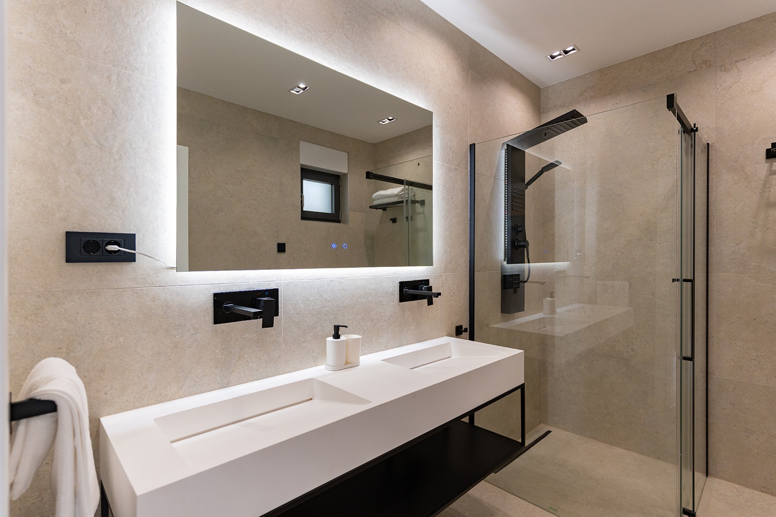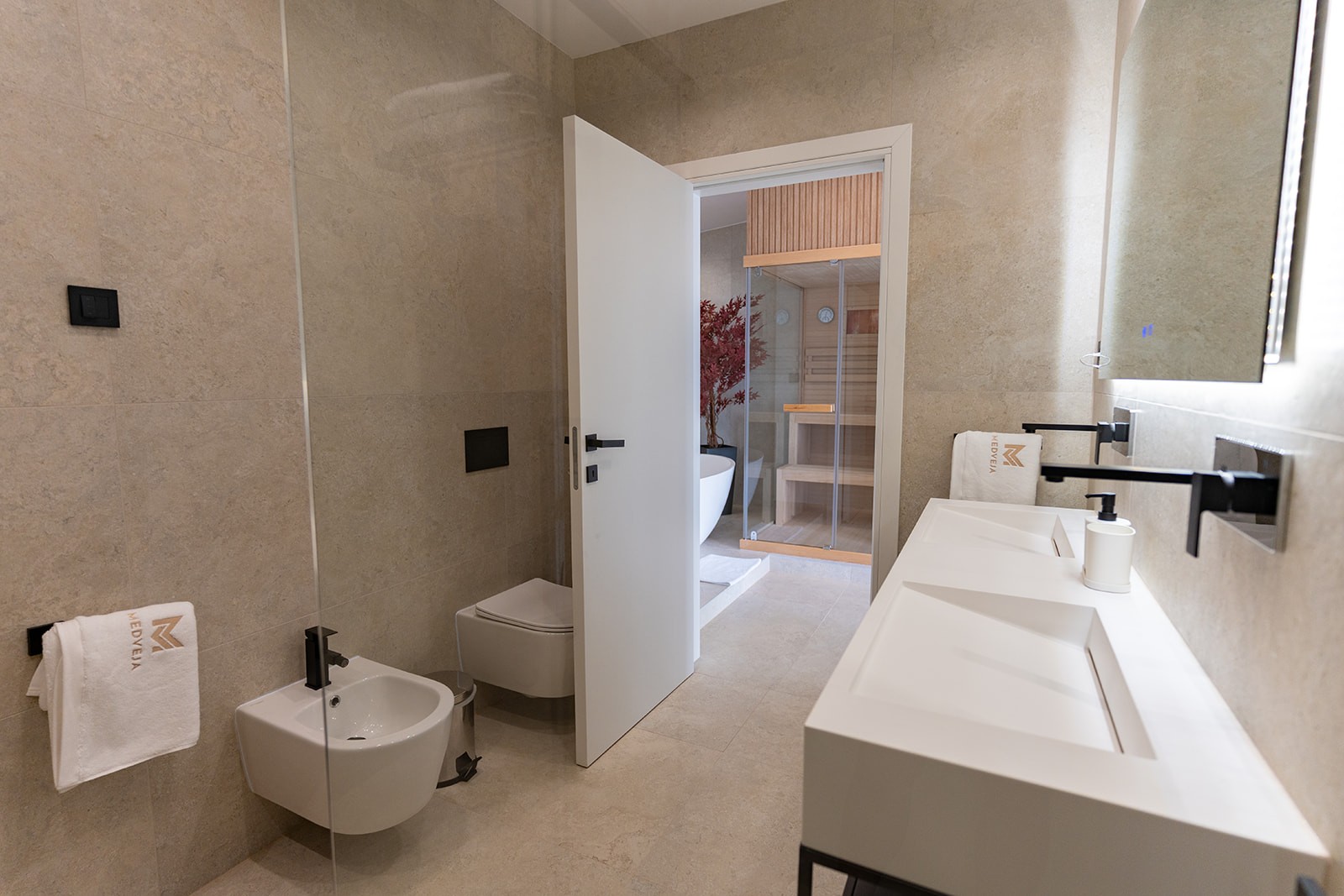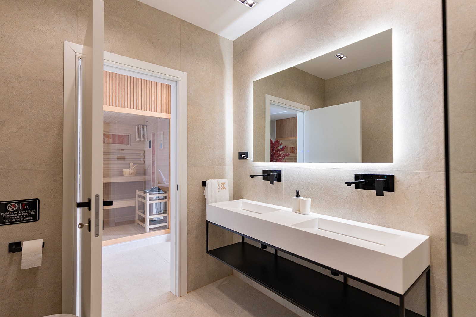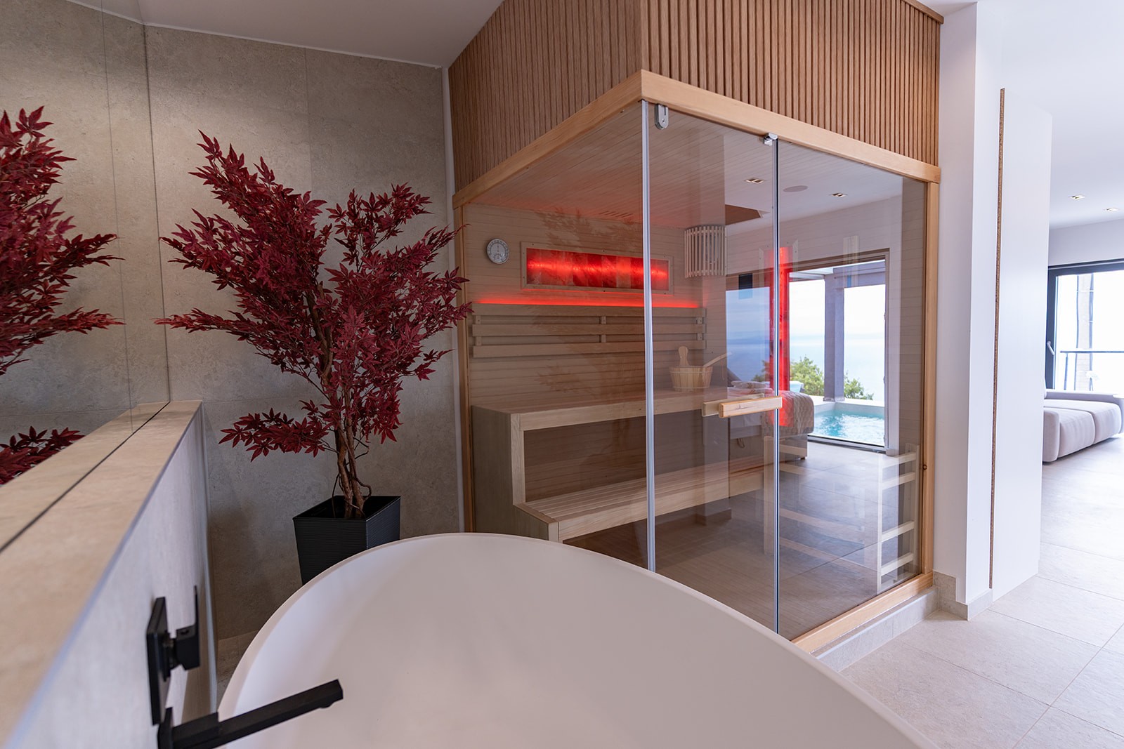 This luxurious villa has a spacious bedroom with an ensuite bathroom, perfect for couples. The bedroom opens directly to a private infinity pool with stunning sea views, offering a peaceful and beautiful setting for your romantic getaway. Thi villa also includes a wellness room with a rejuvenating sauna and freestanding batthub, and a fully equipped kitchen for preparing gourmet meals. Step outside to the outdoor spaces where you’ll find a BBQ for outdoor dining and a manicured garden to enjoy the Mediterranean sunshine. Whether you’re soaking in the pool, indulging in the sauna, or admiring the panoramic sea views from the bedroom, the One Bedroom Sky Pool Villa in Medveja offers a luxurious and unforgettable escape on the Croatian coast.